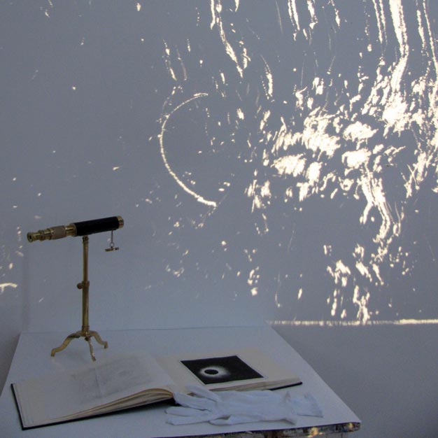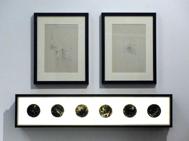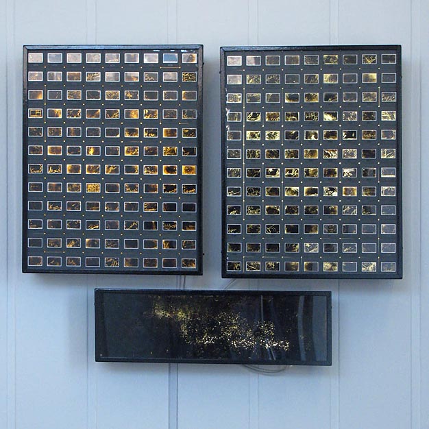 Untitled Lightboxes, (Soot Slide Series), mixed media and needlepoint on sooted glass